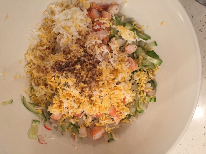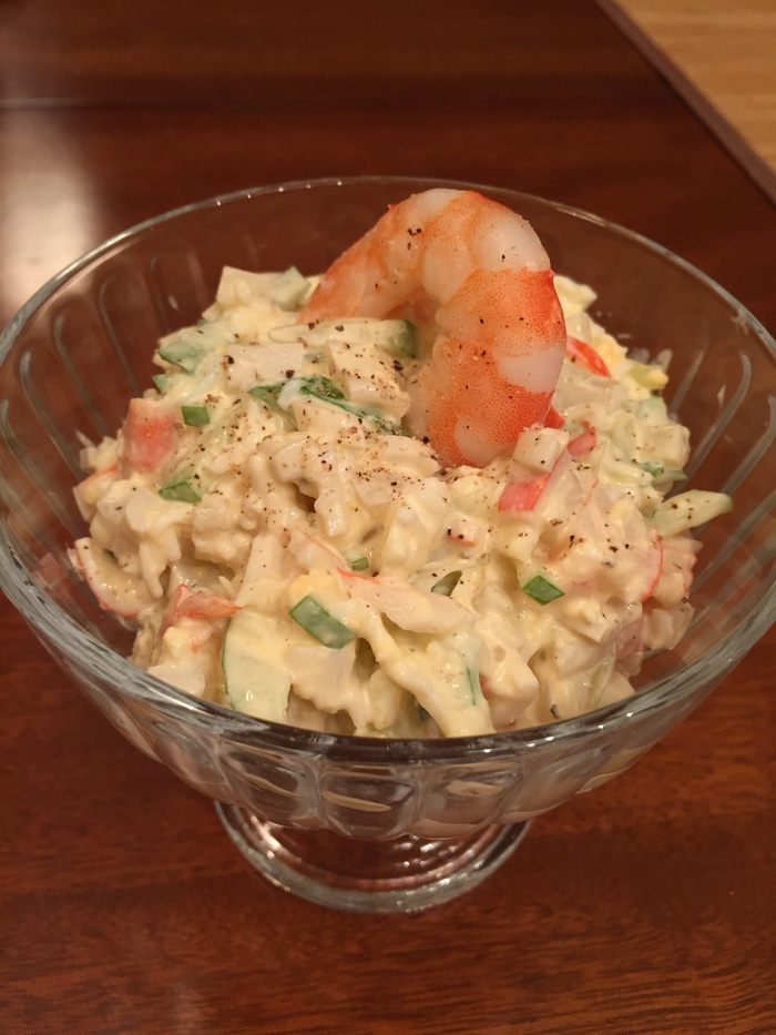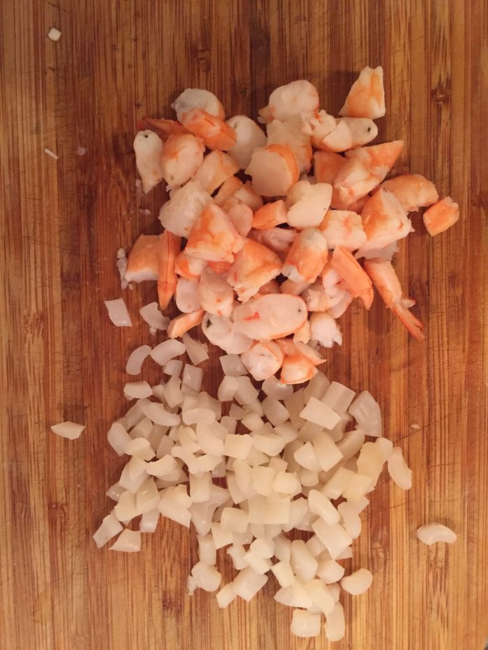 Креветки и кальмара нарезаем крупнее, чем крабовые палочки.