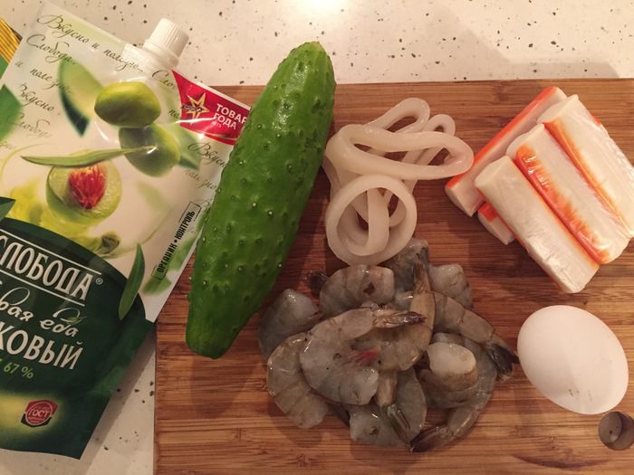 Подготовим ингредиенты. Креветки (я использую крупные, не вареные) и кальмары чистим и отвариваем. Яйца отварить и почистить.