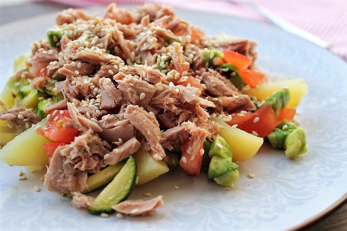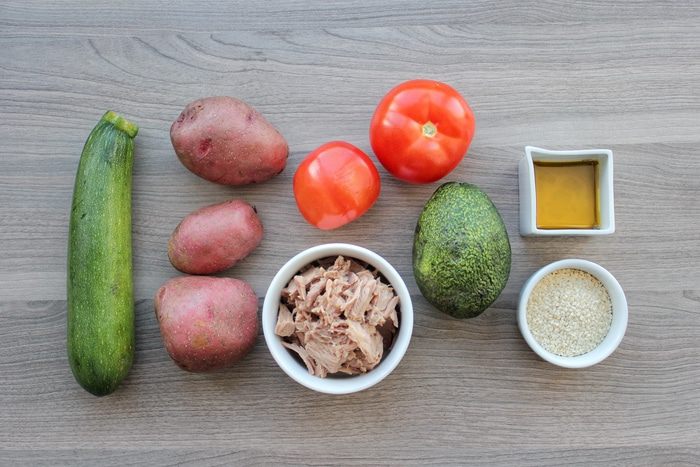 При подаче выкладываем на порционную тарелку дольки картофеля, сверху цукини, массу из томатов и авокадо. На подушку из овощей выкладываем тунец, поливаем кунжутным маслом и посыпаем золотистым кунжутом.