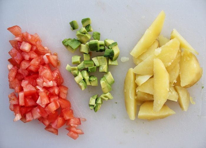 Готовый картофель немного остужаем (так, чтобы комфортно было дальше с ним работать), удаляем кожуру и нарезаем дольками. Томат и авокадо соединяем, перемешиваем. Кунжут обжариваем в течение 30 секунд до появления характерного золотистого цвета.