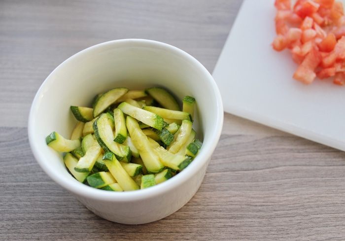 Томат и авокадо нарезаем кубиком, цукини нарезаем соломкой. Далее обжариваем цукини на заранее разогретой сковороде с добавлением кунжутного масла Biolio в течение трех минут, помешивая.