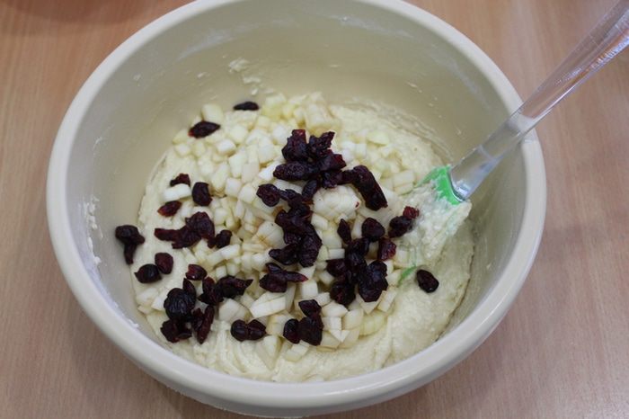 Яблоки очистить, нарезать кубиками, добавить вместе с клюквой в тесто.