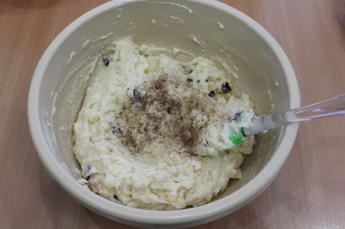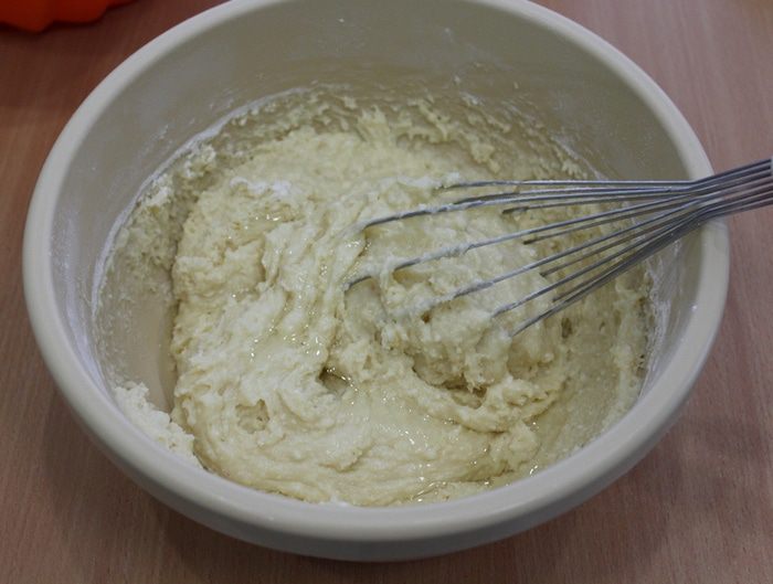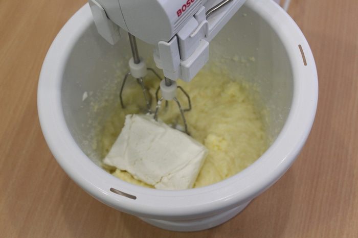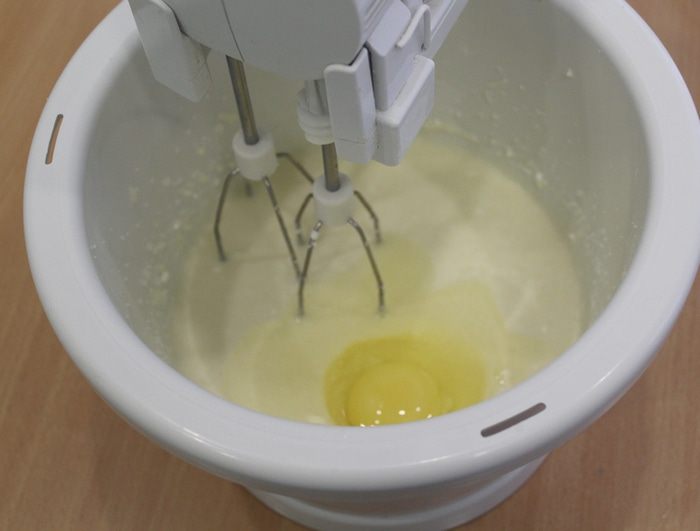 Затем добавить творог и еще раз взбить. При необходимости творог необходимо протереть через сито. Добавить яйца и еще раз взбить.