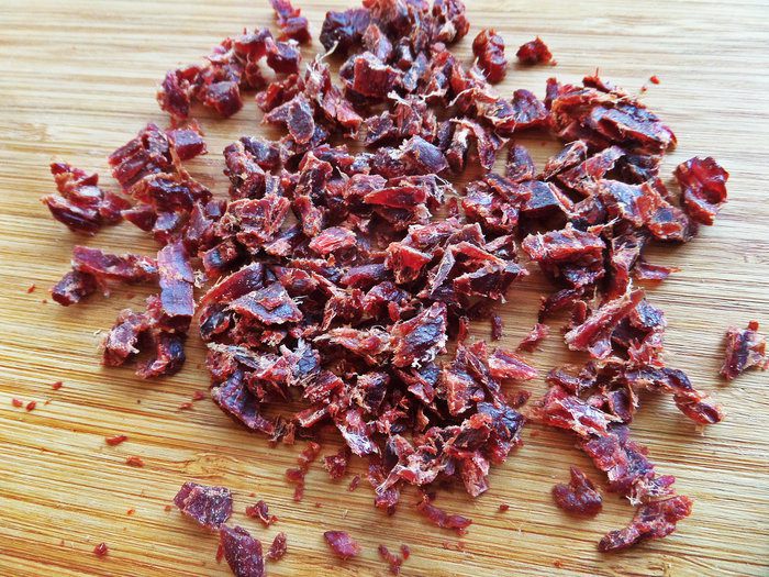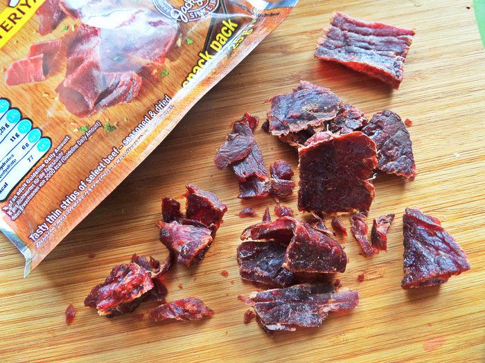 Для пикантности я решила использовать мясной снек — сушеные говяжьи кусочки в соусе терияки. Нужна 1 пачка весом 25 г.