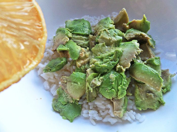 Снять с кожуры и сбрызнуть лимонным соком. Отправить к рису.