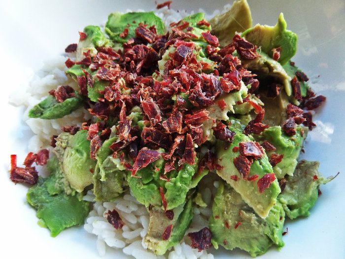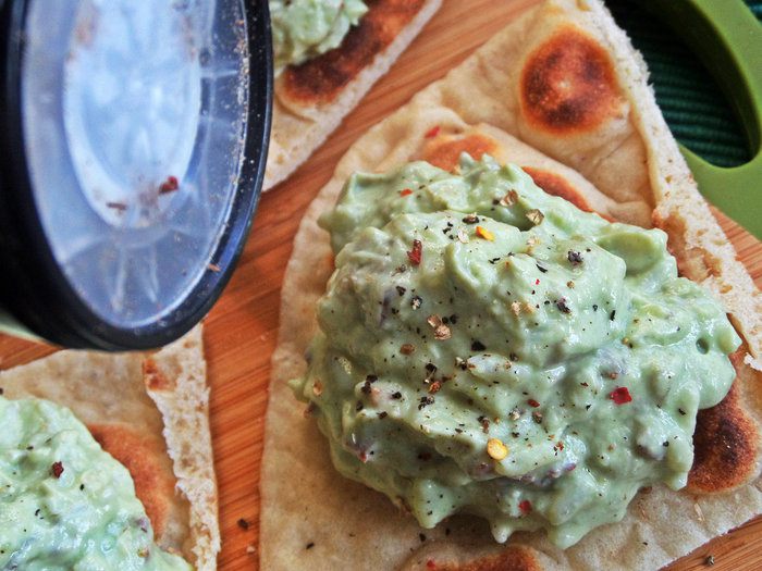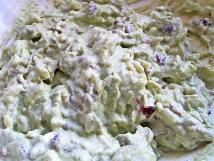 Высыпать за авокадо. Кстати, постояв в паштете, мясо станет мягче.
