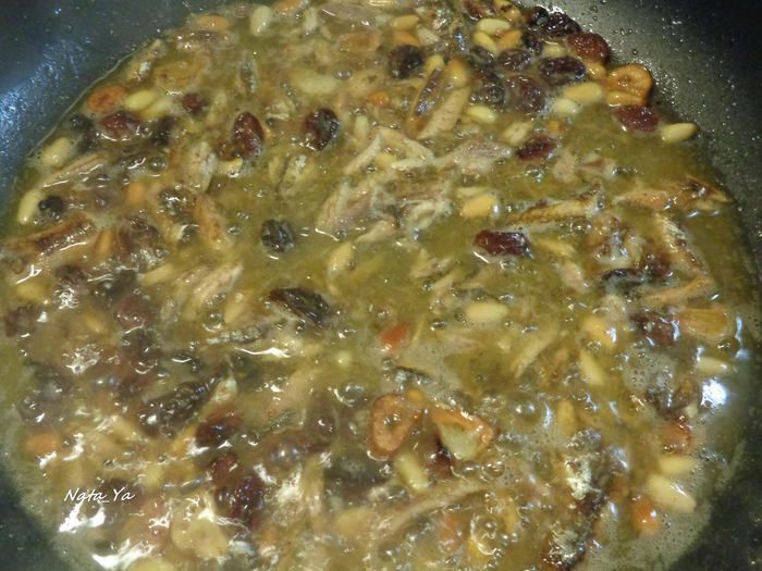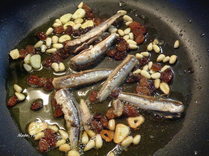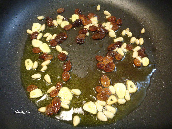 Отварите тальятелле до состояния аль денте. Часть воды, в которой варились тальятелле? сохраните. Чеснок очистите, нарежьте пластинками и спассеруйте на оливковом масле до состояния, когда он начнет менять цвет. Добавьте изюм и кедровые орешки.