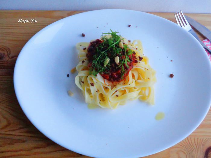 Меня всегда привлекают быстрые, но эффектные рецепты. Этот как раз из таких! Надоели банальные макароны?! Разбавьте свое меню тальятелле под изысканным соусом на основе белого вина. Изюм, кедровые орешки, анчоусы, входящие в состав томатного соуса, придадут тальятелле яркий вкус и неповторимый аромат. А хлебная крошка не даст остыть тальятелле слишком быстро и подчеркнет вкус этого гурманского блюда.