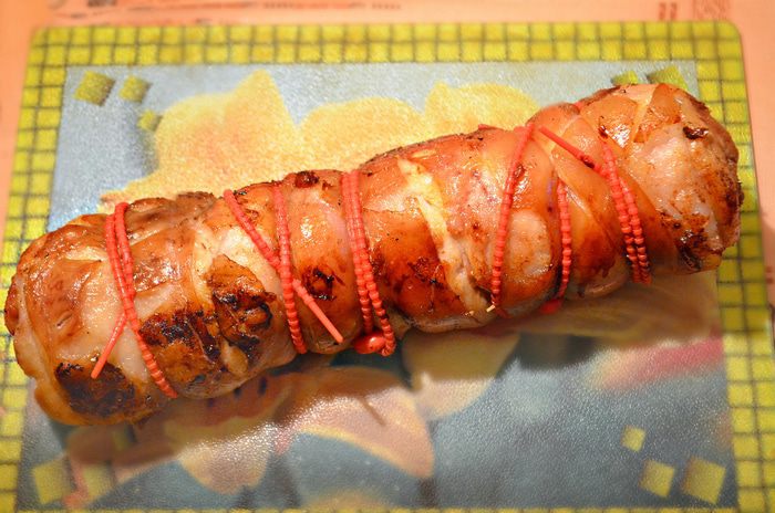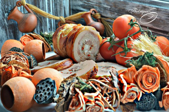 После запекания достаньте поркетту из духовки, аккуратно снимите фольгу и бумагу с поркетты. Рулет выложите на застеленный новым куском пекарской бумаги противень. После чего увеличьте температуру духовки до 200ºС. Далее поместите поркетту снова в духовку минут на 30, чтобы свиная шкура подрумянилась, запеклась и стала хрустящей. Во время запекания необходимо часто переворачивать поркетту, чтобы она равномерно запеклась и стала хрустящей. Когда шкура запеклась, нужно достать поркетту, дать ей минут «отдохнуть» в течение 15 мин.