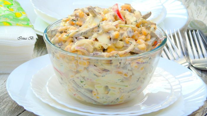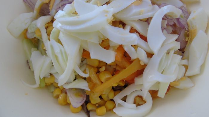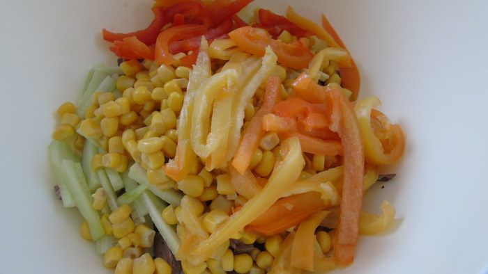 Огурец, перец также нарезаем соломкой и отправляем к сердцу. Добавляем кукурузу.