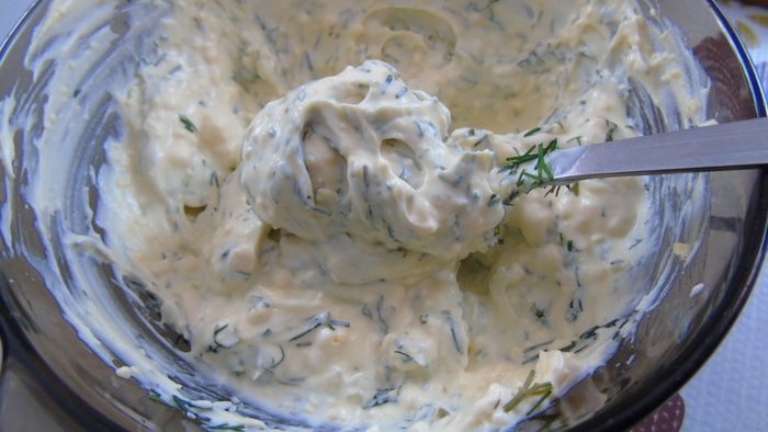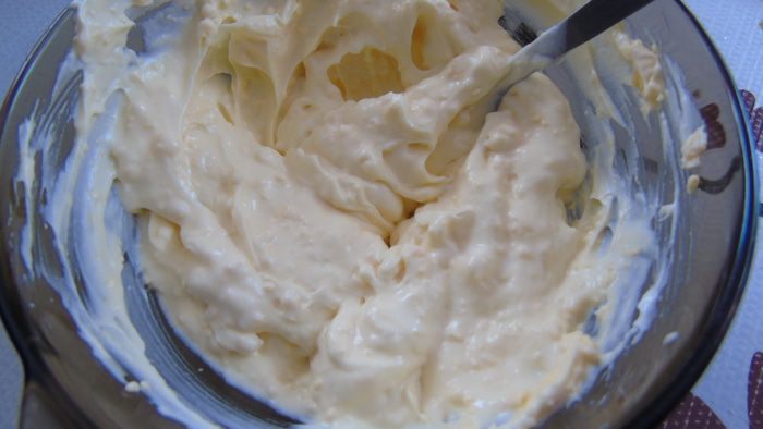 А желтки растираем со сметаной.