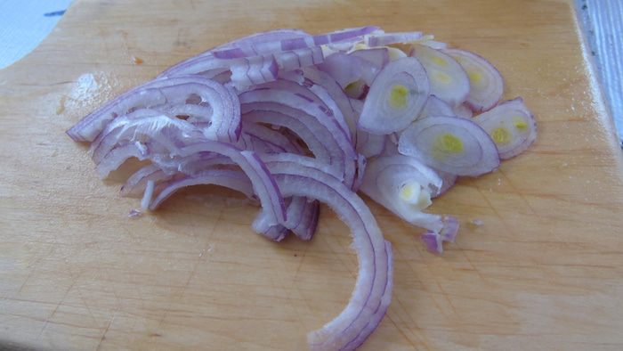 Лук нарезаем полукольцами и также отправляем в салат.