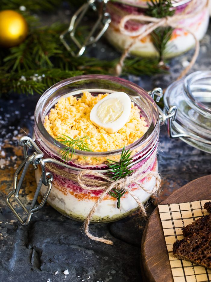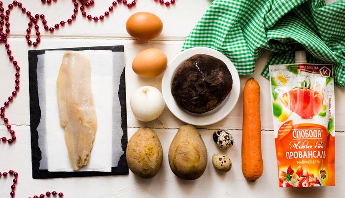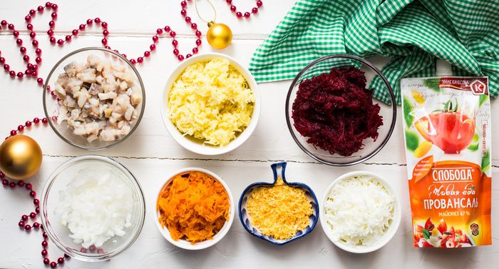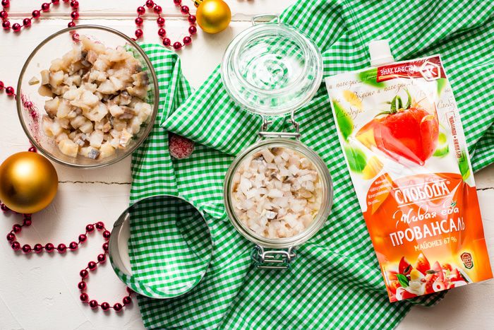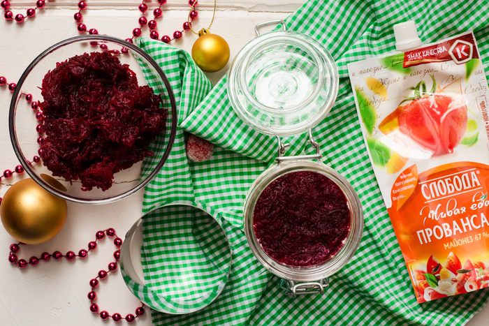 Все овощи и яйца очистите и натрите отдельно на мелкой терке (тогда селедка под шубой получится очень нежная и сочная). Если свекла очень сочная, отожмите немного сок. Лук очень мелко нарежьте, и ошпарьте кипятком, сразу откиньте на дуршлаг, чтобы стекла лишняя вода. Удалите у филе все косточки, а мелкие выньте пинцетом. Затем филе нарежьте на небольшие кусочки.