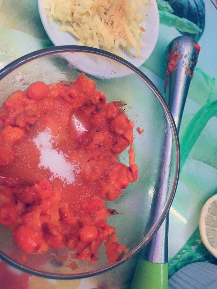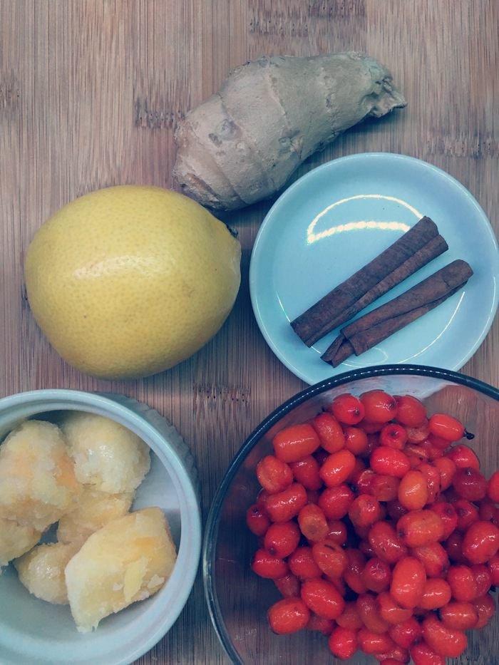 Облепиху истолочь в пюре с добавлением столовой ложки сахара или меда. Имбирь натереть на терке.