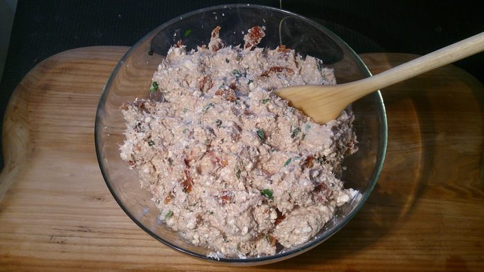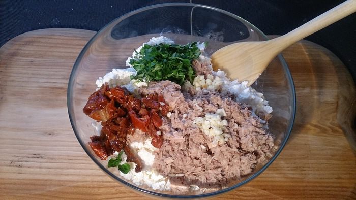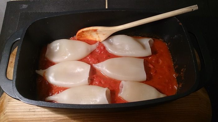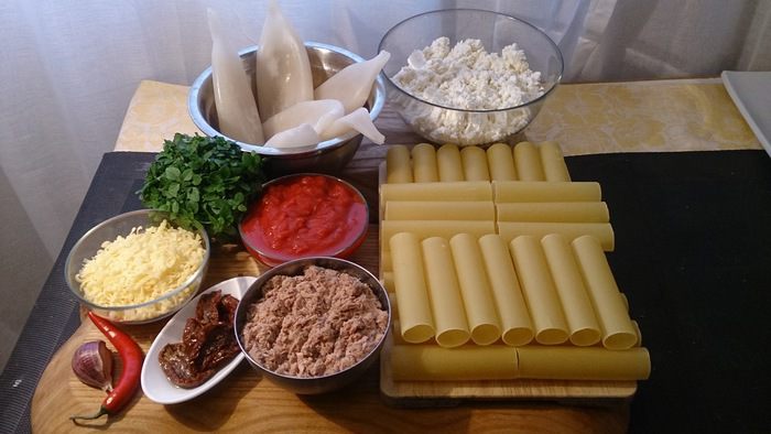 Друзья основательно настояли, что под конец конкурса обязательно нужно приготовить это блюдо. Как-то делал его на большую дружную компанию, и все были в восторге! Начинка для каннеллони достаточно простая, но очень вкусная — творог, смешанный с консервированным тунцом, вялеными томатами, базиликом и чесноком, еще добавляем целиком тушки кальмаров и густой немного острый томатный соус. В результате получается сытное, вкусное, ароматное блюдо на веселую компанию. И так начнем готовить!
