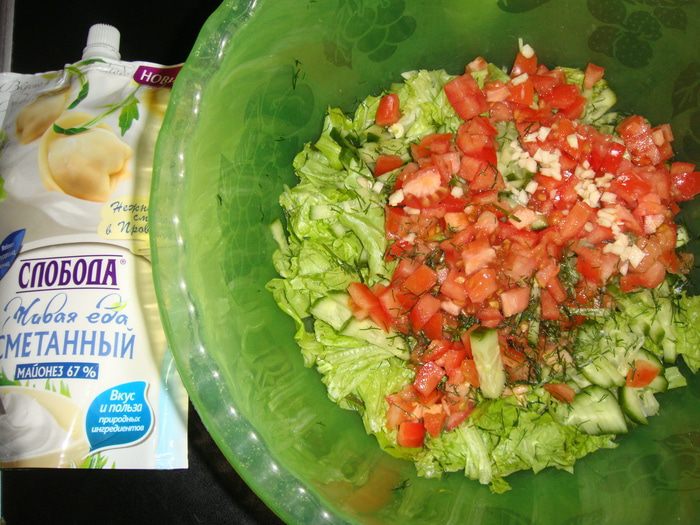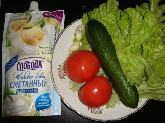 Огурец, помидоры, салат и укроп помыть и обсушить.