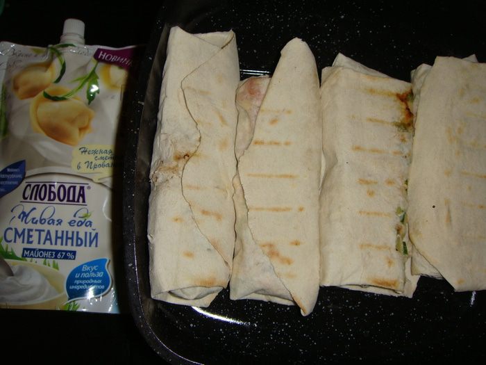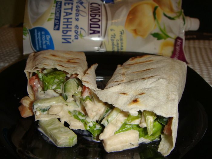 Ролл с курицей и овощами отлично подойдет для перекуса. Хрустящий лаваш с сочной начинкой.