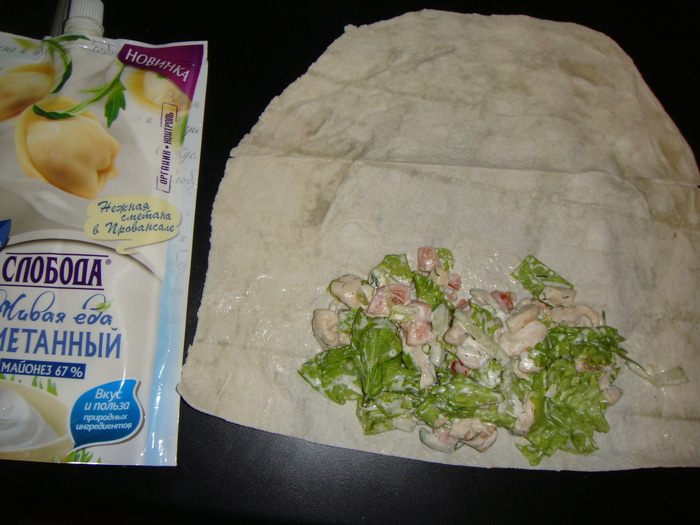 Листы лаваша разрезать пополам. Выложить часть начинки на один край, подвернуть лаваш с двух сторон и свернуть рулетом.