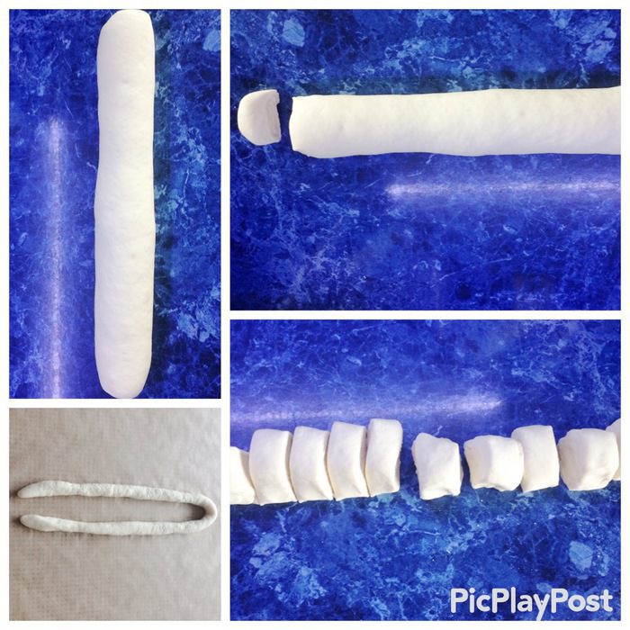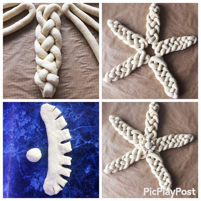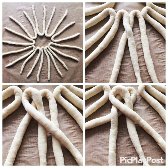 Каждый жгут складываем пополам, как подкову, и выкладываем жгуты по кругу, чтобы получилось солнышко, на бумаге для выпечки.
