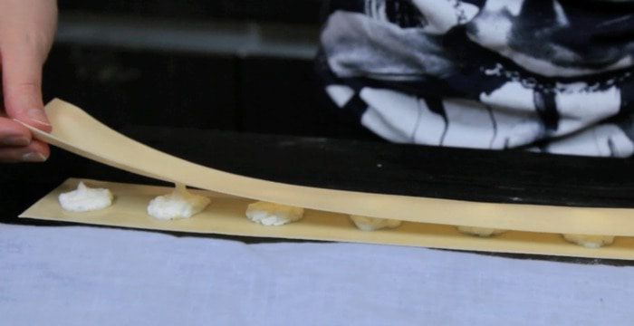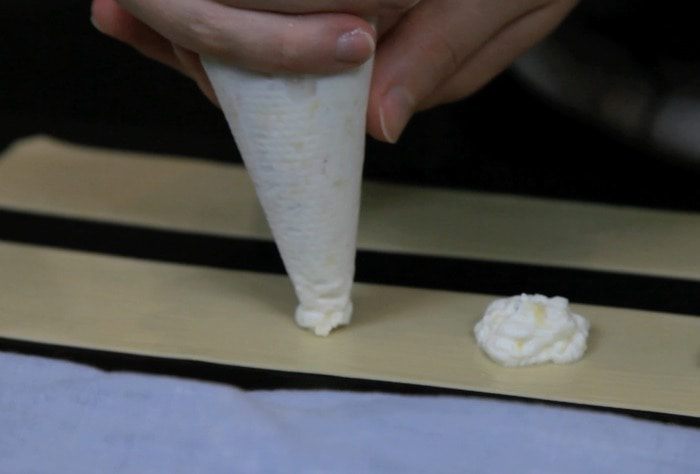 Затем на одну полоску на равных расстояниях отсадить начинку.