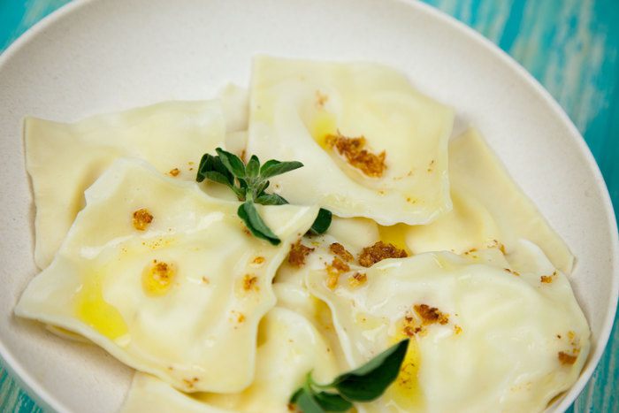 Остается только отварить равиоли: вскипятить воду и варить 5 минут. Подавать с чесночным маслом.