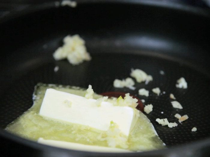 Для начала сделаем чесночное масло. Растопить масло на медленном огне, добавив чеснок. Жарить до красивого карамельного цвета.