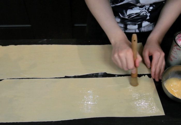 Нарезать на одинаковые полоски и смазать взбитым яйцом.