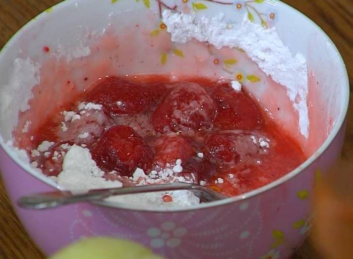 Клубнику засыпать оставшейся сахарной пудрой, слегка перемешать и дать постоять, затем все размять толкушкой.