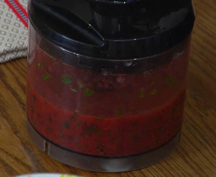 Половину клубники с сахарной пудрой поместить в чашу блендера, добавить свежемолотый перец, листья базилика без веточек и измельчить в пюре.