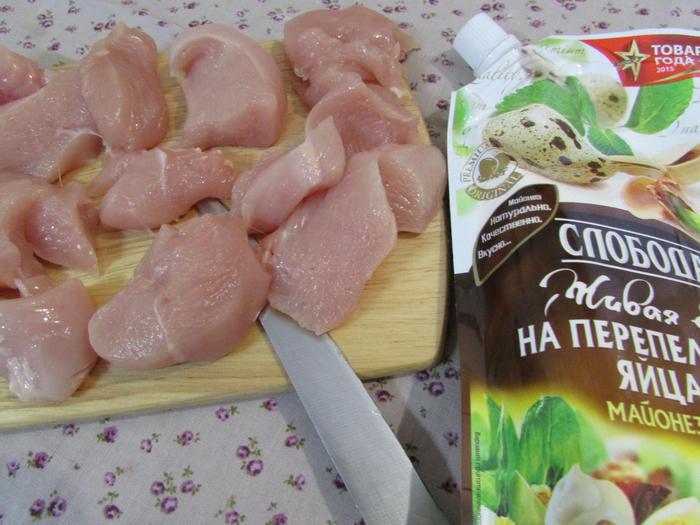 Куриное филе вымыть, просушить, нарезать небольшими кусочками. И пробить в блендере до однородности фарша.