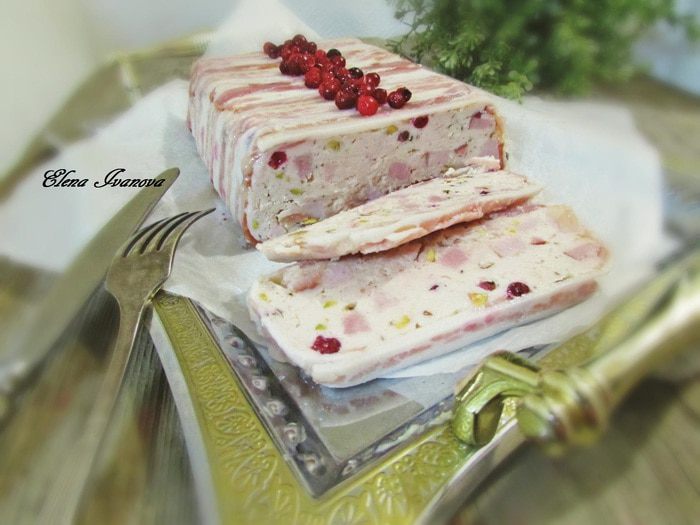 Предлагаю приготовить нежный куриный террин с фисташками и брусникой, пропитанный ароматом бекона. Это легкое, сытное и очень вкусное блюдо, которое станет достойным украшением праздничного стола. И, конечно же, сделав куриный террин по этому рецепту, вы непременно получите массу похвал, получается очень вкусно!