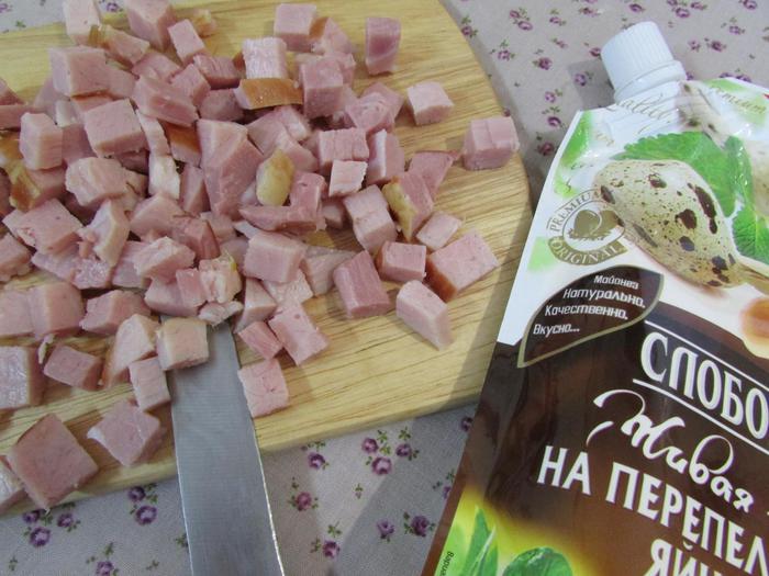 Ветчину нарезать мелким кубиком.