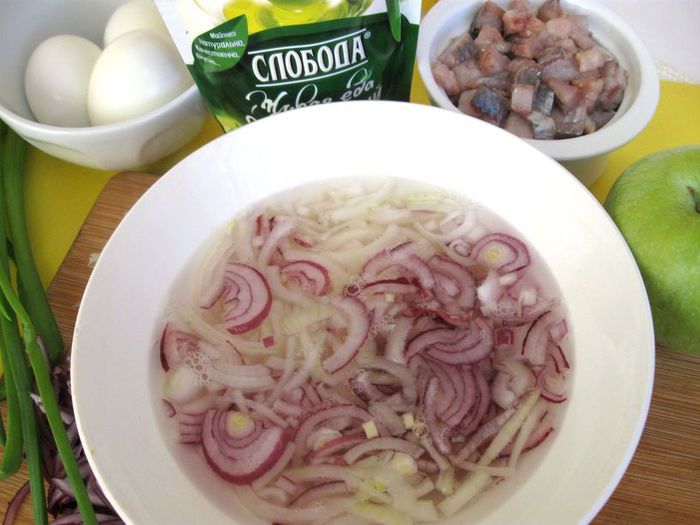 Лук залить кипятком на пару минут, чтобы ушла горечь, и он стал чуть мягче.