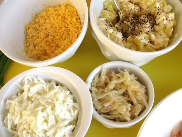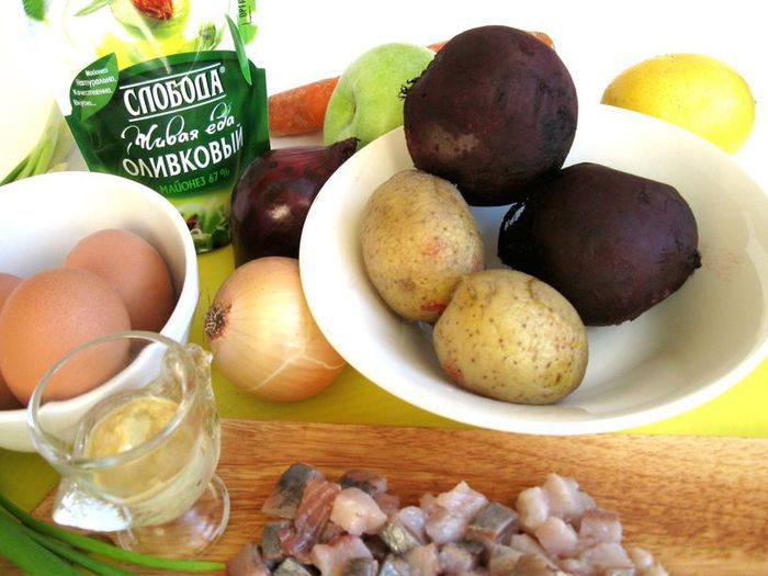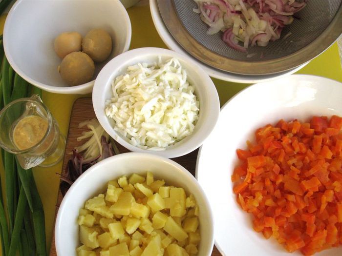 Приготовить все необходимое. Вареные овощи предварительно должны быть охлаждены в холодильнике. Сварить яйца вкрутую.