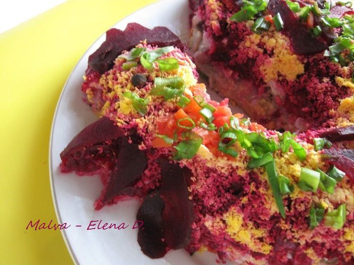 Селедка под шубой — частый гость на новогоднем столе. Вариантов оформления блюда множество, в этот раз я решила придать селедке под шубой форму петуха — символа Нового года по восточному календарю. Он получился разноцветный, праздничный благодаря ярким овощам и майонезу «Слобода» оливковый.