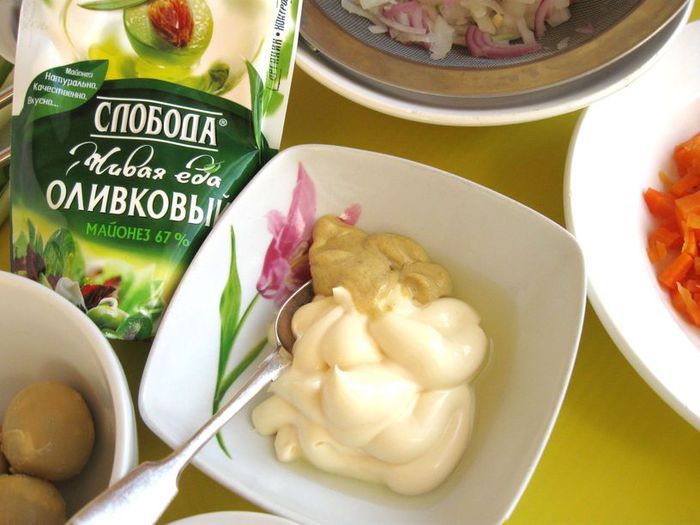 Майонез «Слобода» оливковый смешать с горчицей и лимонным соком (1 ч. л.).