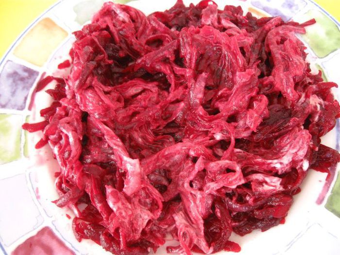 Свеклу натереть на крупной терке. Все овощи по отдельности смешать с заправкой, также заправить белок. Выложить слои в следующем порядке: картофель, лук, сельдь, морковь, яблоко, белок яйца, свекла.
