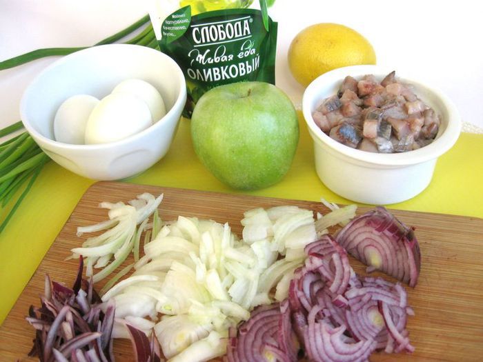 Репчатый и красный лук нарезать тонкими полукольцами, которые еще разрезать пополам. Яйца почистить.