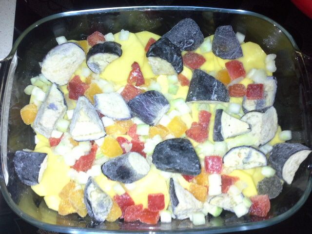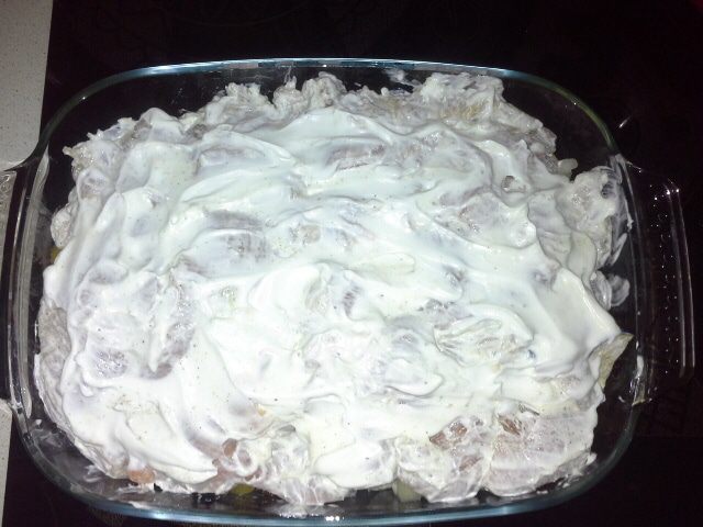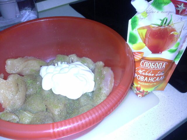 Сверху овощей выкладываем маринованное куриное филе и щедро смазываем майонезом Провансаль ТМ «Слобода». Ставим в духовку на 1,5 часа при температуре 220°С. Форму с блюдом накрыть фольгой, чтобы майонез не пригорел. За 15 минут фольгу снять, майонез поджарится до золотистого цвета.