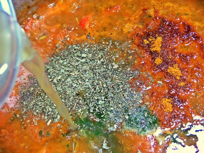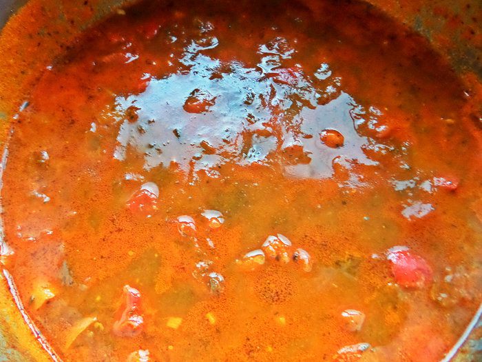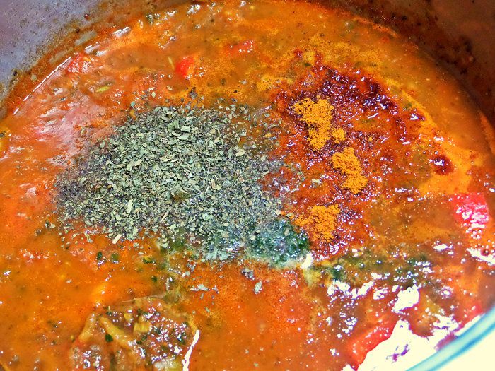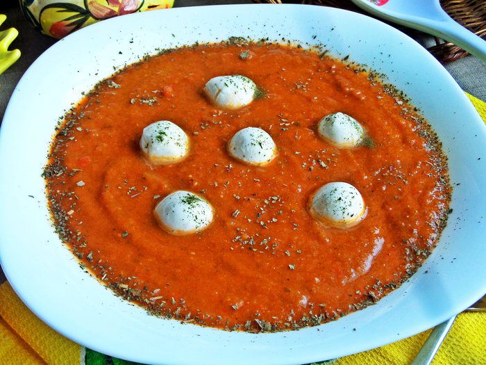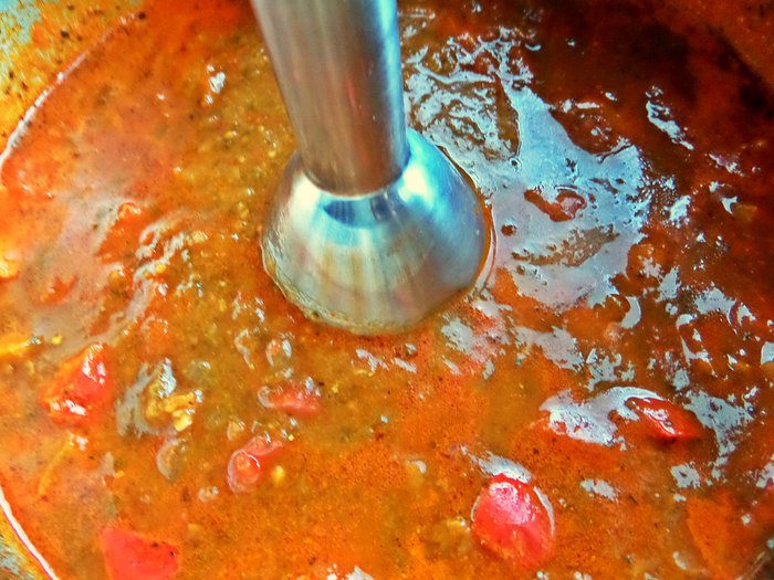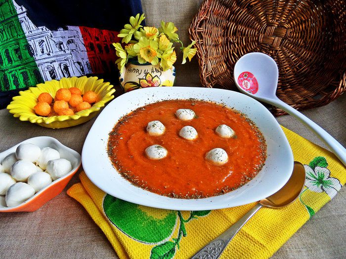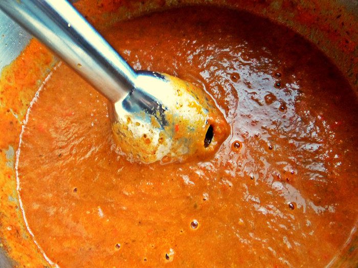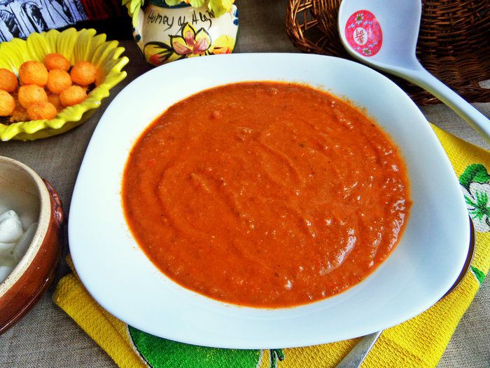 Густоту супа регулируем по своему вкусу, разбавляем бульоном или водой, но бульоном вкуснее. Помидоры с пастой тоже можно взаимозаменять, кому что нравится, но для насыщенного цвета вполне хватает пары ложек томатной пасты.