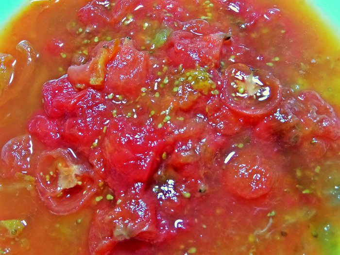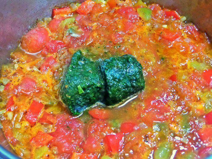 С томатов снять кожицу, порубить крупно. У меня из морозилки заготовка размороженная.