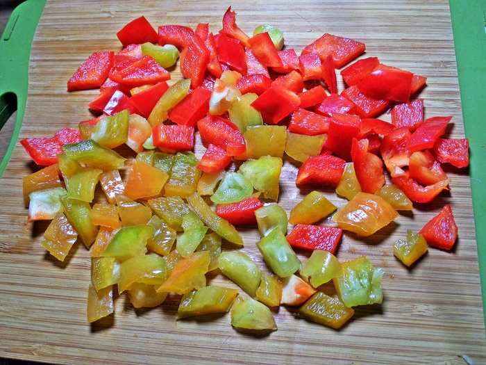 Перец нарезать произвольно кубиками. У меня двух видов, но можно брать один красный перец.