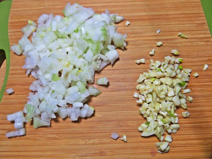 Нарезать лук, чеснок.