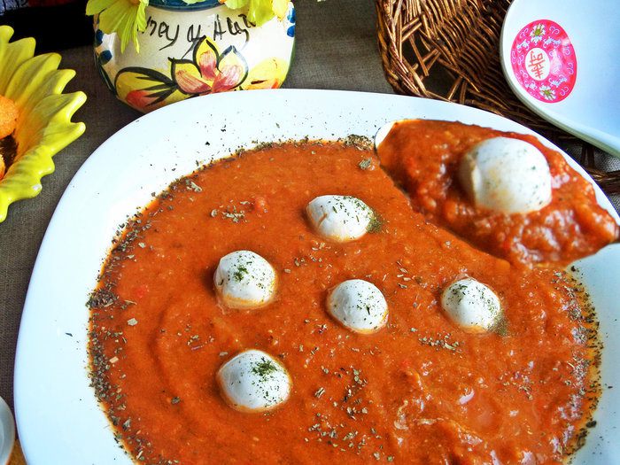 Добавить несколько шариков в каждую тарелку. Если моцарелла одним шариком, нарезать на пластинки и положить 1 в тарелку.