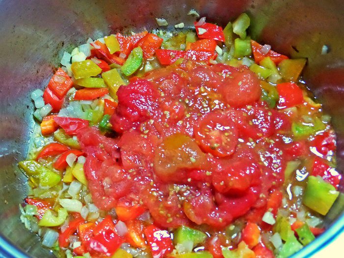 Перенести в обжаренные овощи. Если томаты кислые, добавить сахар (ложку).