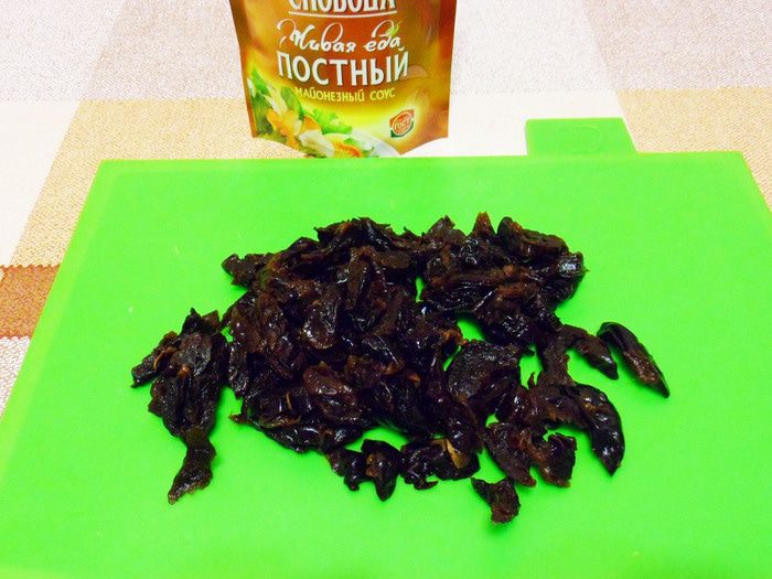 Чернослив отжать и нарезать соломкой.