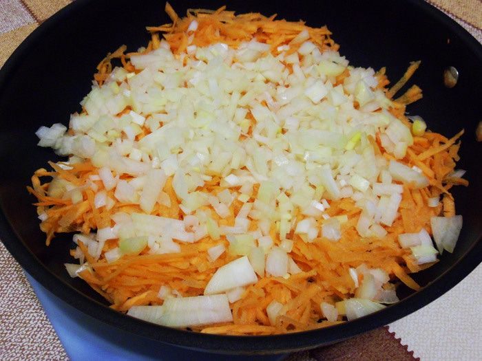 Отдельно, в другой сковороде, пожарить (только до мягкости моркови и лука) тертую морковь и вторую часть лука.