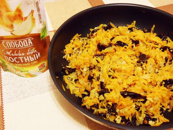Соединить обжаренные морковь и лук с черносливом и грецкими орехами. Посолить, поперчить по вкусу. Тщательно перемешать.