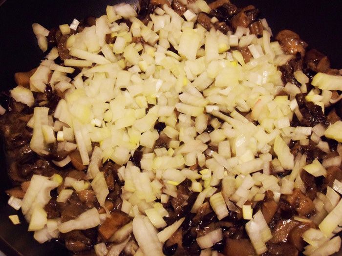 На сковороду налить совсем немного растительного масла. Грибы и половину лука обжарить, помешивая, примерно 10 минут после выпаривания жидкости.