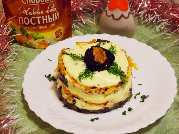 Если вы любите грибы, орехи и чернослив, то вам придется по вкусу этот салат. Во время долгого поста так не хватает привычных блюд. Многие постящиеся признаются, что легко переносят отсутствие мяса, но скучают по салатам с майонезом. Классический майонез употреблять в пост нельзя, ведь это соус на основе яиц. В постном майонезе от ТМ «Слободы» нет продуктов животного происхождения и если, вы возьмете этот постный майонез, то салат «Анастасия» выручит вас в пост. Этот салат очень вкусный, питательный и просто красивый!